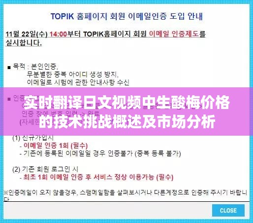 随着全球化进程的加速和信息技术的飞速发展,实时翻译技术已成为跨文化交流的关键桥梁,特别是在在线视频内容的传播中,实时翻译技术对于语言障碍的突破作用日益凸显,对于某些特定语境下的内容,如涉及特定商品价格的翻译,其复杂性和精确性要求更高,本文将针对“实时翻译日文视频中的生酸梅价格”这一特定情境进行分析和探讨。