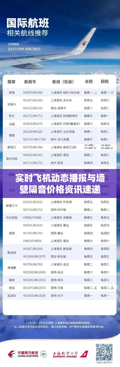 尊敬的读者朋友们,今天我们将为您带来一则关于实时飞机最新情况播报以及墙壁隔音价格的信息分享,在这篇文章中,我们将为您介绍最新的飞机动态,同时探讨墙壁隔音的重要性和价格因素,让我们一同领略航空领域的最新进展,并了解如何为您的生活空间增添舒适与宁静。