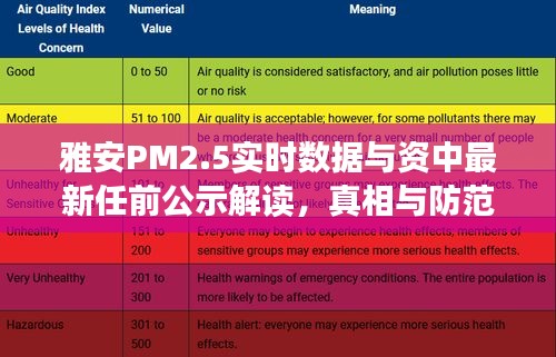 随着环境保护意识的日益增强,空气质量指数(AQI)成为了公众关注的焦点,雅安作为四川省的重要城市,其空气质量状况尤为引人关注,资中县的最新任前公示也引起了广泛关注,本文将围绕雅安PM2.5实时数据和资中最新任前公示进行全方位释义,解读其价值和意义,并揭露相关的虚假宣传现象,强化公众警惕意识。